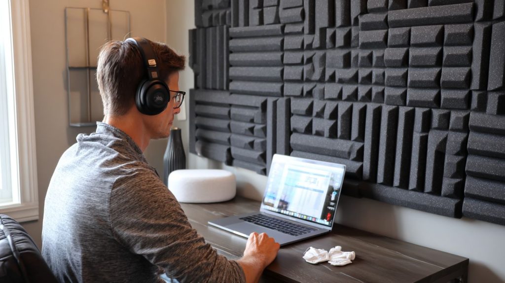 Options like Auralex, ATS Acoustics at $149 for broadband absorption, or DIY rockwool setups around $30 fit budgets. Install five panels on walls behind your desk. This absorbs midrange noise effectively.